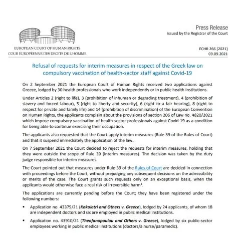 Στις 2 Σεπτεμβρίου, 30 Έλληνες υγειονομικοί που εργάζονται σε δημόσια νοσοκομεία υπέβαλαν δύο αιτήματα κατά του υποχρεωτικού εμβολιασμού.