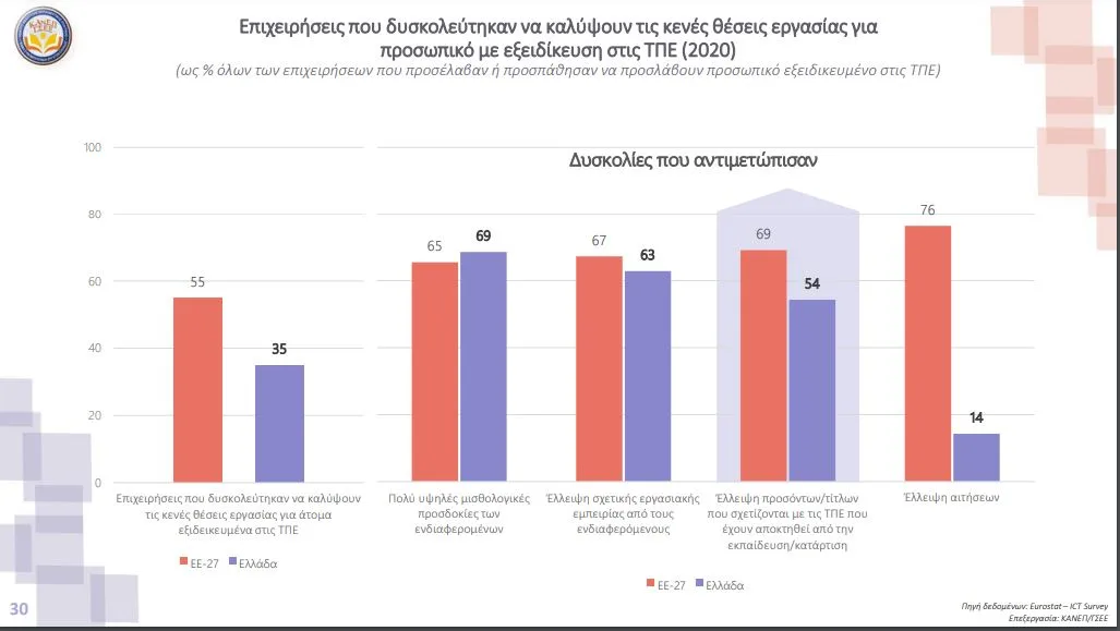 Οι επιχειρήσεις στην Ελλάδα ζητούν εξειδικευμένο προσωπικό, όμως εκφράζουν αδυναμία κάλυψης των θέσεων και σε ποσοστό 69% δηλώνουν ότι οι ενδιαφέρομενοι έχουν υψηλές οικονομικές απαιτήσεις, σε ποσοστό 63% ότι δεν έχουν σχετική εργασιακή εμπειρία και σε ποσοστό 54% ότι υπάρχει έλλειψη προσόντων και τίτλων.