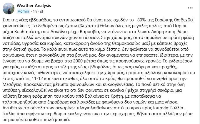 Σύμφωνα με την σελίδα πρόγνωσης καιρού Weather Analysis, το 80% της Ευρώπης θα δεχθεί χιονοπτώσεις. Τα δεδομένα ως έχουν (βλ χάρτη) θέλουν όλες τις μεγάλες πόλεις, από Παρίσι μέχρι Βουδαπέστη, από Λονδίνο μέχρι Βαρσοβία, να ντύνονται στα λευκά. Ακόμη και η Ρώμη, παίζει σε πολλά σενάρια πυκνών χιονοπτώσεων. Στην χώρα μας, αυτό σημαίνει σε πρώτη φάση νοτιάδες, υγρασία και κυρίως, κατακόρυφη άνοδο της θερμοκρασίας μαζί με κάποιες βροχές στην δυτική χώρα.