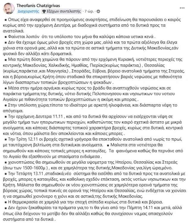 Πιο συγκεκριμένα, σύμφωνα με την ανάρτηση του προγνώστη σε σελίδα στο Facebook το υπόλοιπο του μήνα θα καλύψει κάποια υετικά κενά. Θα έρθουν βροχές αλλά και τα πρώτα αξιόλογα χιόνια. Μια πρώτη δόση χειμώνα θα πάρουν από την ερχόμενη Κυριακή, νοτιότερες περιοχές της κεντρικής Μακεδονίας, Χαλκιδικής, Ημαθίας, Πιερίας.