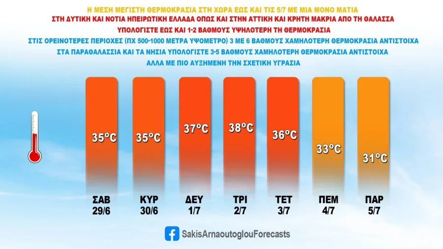 Σύμφωνα με τον έμπειρο προγνώστη και νυν ευρωβουλευτή του ΠΑΣΟΚ, ο καιρός στα μέσα της εβδομάδας θα είναι σε συνθήκες καύσωνα με 38άρια να… σαρώνουν τη χώρα ωστόσο μέχρι την Παρασκευή θα έχει πέσει η θερμοκρασία κατά επτά βαθμούς!