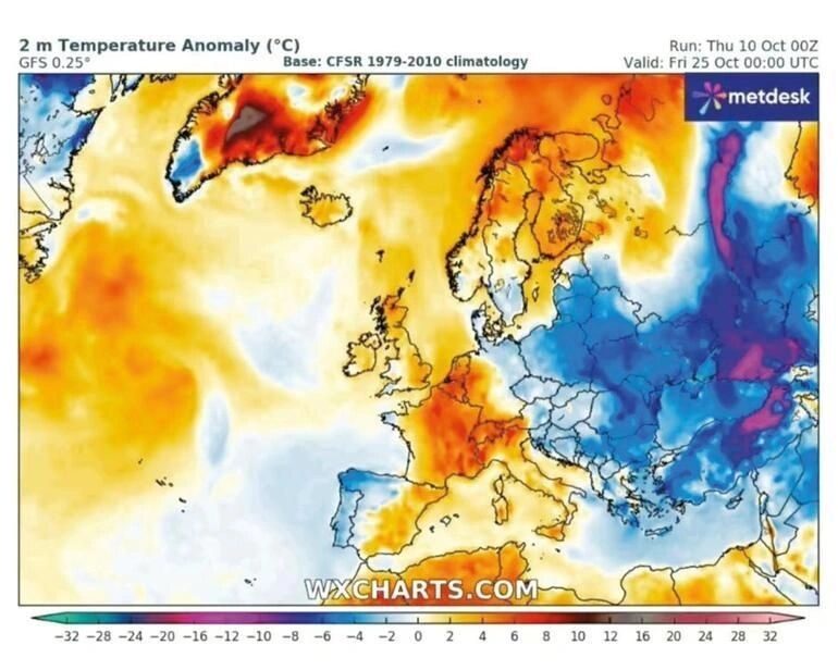 Σύμφωνα με τη μετεωρολογική πλατφόρμα WXCharts από το Ηνωμένο Βασίλειο, οι νότιες ακτές της ευρωπαϊκής ηπείρου και η Ελλάδα θα επηρεαστούν από ένα κύμα ψύχους την τελευταία εβδομάδα του Οκτωβρίου.