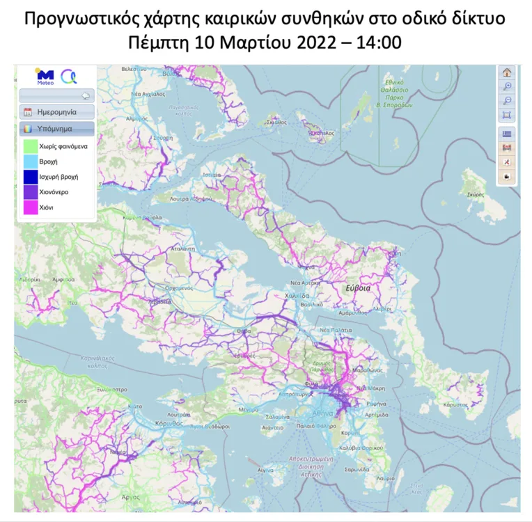 Ο επόμενος χάρτης δείχνει την πρόγνωση για τις καιρικές συνθήκες στο οδικό δίκτυο που θα επικρατήσουν το απόγευμα της Πέμπτης 10/3 στα ανατολικά ηπειρωτικά τμήματα της χώρας μας.