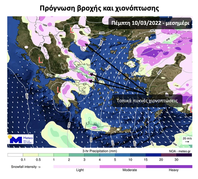 Ο πρώτος χάρτης δείχνει τα προβλεπόμενα ύψη βροχής και την ένταση των χιονοπτώσεων τις απογευματινές ώρες της Πέμπτης 10/3.