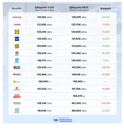 Ειδικότερα, ο υπουργός Ανάπτυξης και Επενδύσεων, Άδωνις Γεωργιάδης, δημοσίευσε την συνολική αξία για το καλάθι του νοικοκυριού, ανά super market σε σχέση με την προηγούμενη εβδομάδα.