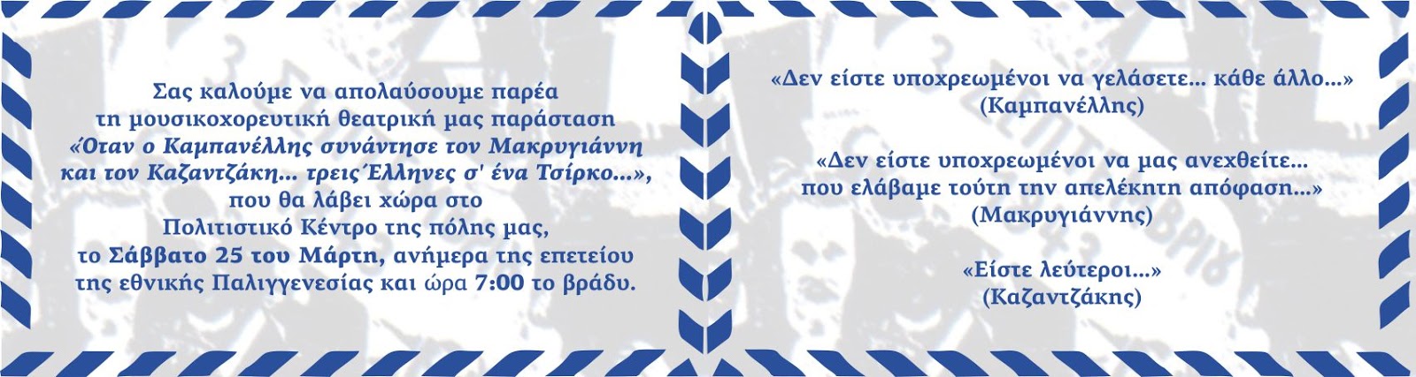 Στην παράσταση, με εμβόλιμα αποσπάσματα μεγάλων έργων του, αφιερώσαμε στον "λεξιπλάστη" της καρδιάς μας Νίκο Καζαντζάκη, αφού φέτος συμπληρώθηκαν 60 χρόνια από το θάνατό του.