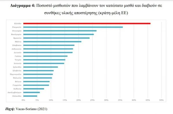 Το 46% των μισθωτών στην χώρα μας που αμείβονται με τον κατώτατο μισθό και ζουν σε συνθήκες υλικής στέρησης. Το ποσοστό αυτό είναι το υψηλότερο ανάμεσα στα κράτη-μέλη της Ευρωπαϊκής Ένωσης.