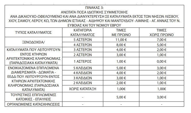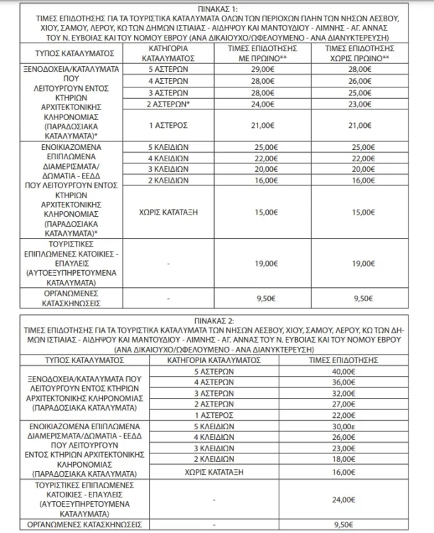 Το ύψος της οικονομικής αξίας της επιταγής που αποτελεί την επιδότηση του δικαιούχου και των ωφελουμένων του για τη διαμονή τους σε τουριστικά καταλύματα, είναι ανάλογο με την περιοχή, τον τύπο και την κατηγορία του τουριστικού καταλύματος και ορίζεται ως εξής: