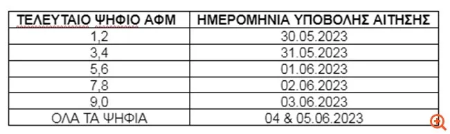 Όπως έχει ανακοινωθεί, για την αποφυγή προβλημάτων, οι αιτήσεις θα κατατίθονται ανάλογα με το τελευταίο ψηφίο του ΑΦΜ των ενδιαφερόμενων δικαιούχων έως τις 05.06.2023 και ώρα 23:59, οπότε θα παραμείνει ανοικτή για όλα τα ψηφία ΑΦΜ, ως εξής: