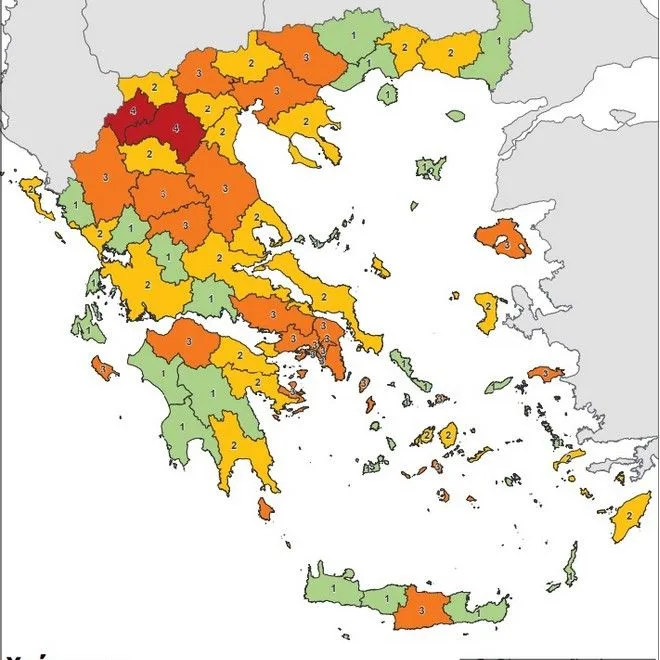 Μέχρι στιγμής, με βάση τον Χάρτη Υγειονομικής Ασφάλειας και Προστασίας, οι Περιφερειακές Ενότητες έχουν κατανεμηθεί ως εξής: