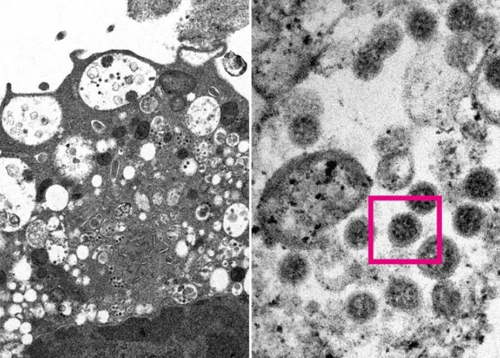 Επιστήμονες στον τομέα της υγείας, συμπεριλαμβανομένων παθολόγων και ιολόγων, κατάφεραν να λάβουν μια ηλεκτρονική μικρογραφία ενός κυττάρου (Vero E6) από το νεφρό ενός πιθήκου που μολύνθηκε με το συγκεκριμένο στέλεχος. Στη συνέχεια το Πανεπιστήμιο δημοσίευσε τις εικόνες χαμηλής και υψηλής μεγέθυνσης.