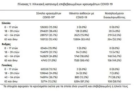 Οι 65 ετών και άνω αντιστοιχούν στο 83.4% των συνολικών θανάτων λόγω κορωνοιού και το 52.5% των διασωληνωμένων με βάση τη χθεσινή έκθεση του Εθνικού Οργανισμού Δημόσιας Υγείας (ΕΟΔΥ). Σημειωτέον ότι από τοσύνολο των ασθενών σε μηχανική υποστήριξη αναπνοής, το 82.7% είναι ανεμβολίαστοι.