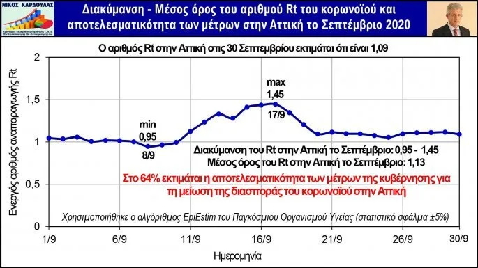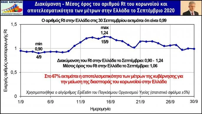 Tο ΕΘΝΟΣ σε συνεργασία με τον Νίκο Καρδούλα παρουσιάζουν δύο πίνακες με επικαιροποιημένα όλα τα στοιχεία του μήνα Σεπτεμβρίου (συμπεριλαμβάνονται και οι σημερινές (30 Σεπτεμβρίου) ανακοινώσεις του ΕΟΔΥ) και για πρώτη φορά μέσα από τον τον ειδικό αλγόριθμο EpiEstim του Παγκόσμιου Οργανισμού Υγείας παρουσιάζονται σε ποσοστιαία κλίμακα ο βαθμός αποτελεσματικότητας των μέτρων που έχει λάβει η κυβέρνηση.