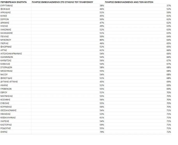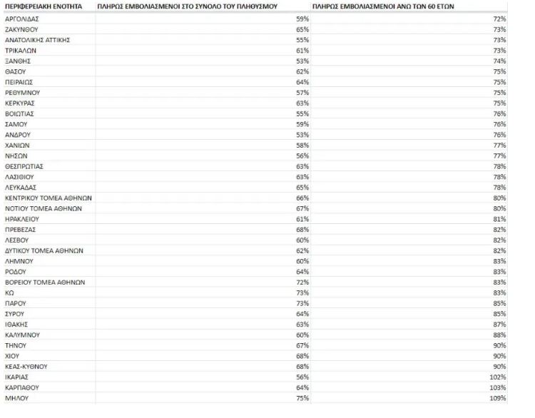 Στους άνω των 60, η εικόνα είναι καλύτερη καθώς, βρίσκονται κάτω από το φράγμα του 70%, με την Ευρυτανία να είναι καθηλωμένη στο 37%.