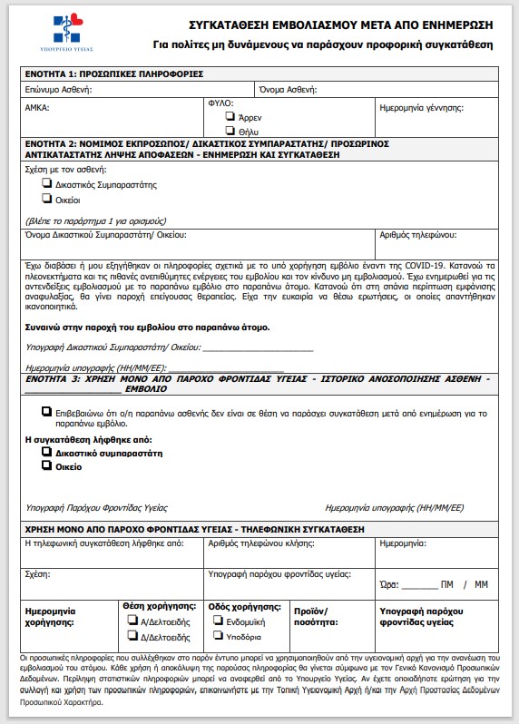 Όσον αφορά το έντυπο συγκατάθεσης θα συμπληρώνεται από «νόμιμο εκπρόσωπο/δικαστικό συμπαραστάτη» ή από κάποιον «οικείο» του ενήλικα που δεν μπορεί να δώσει προφορική συγκατάθεση