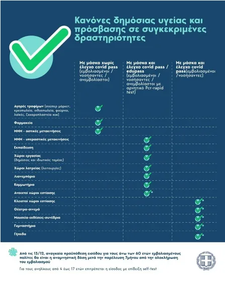 Οι ανεμβολίαστοι πολίτες μπορούν να μπαίνουν σε σούπερ μάρκετ και άλλα καταστήματα για αγορές τροφίμων και ποτών αλλά και σε κομμωτήρια και φυσικά φαρμακεία. Ωστόσο, για καταστήματα λιανικού εμπορίου και κομμωτήρια θα πρέπει να προσκομίζουν αρνητικό rapid test.
