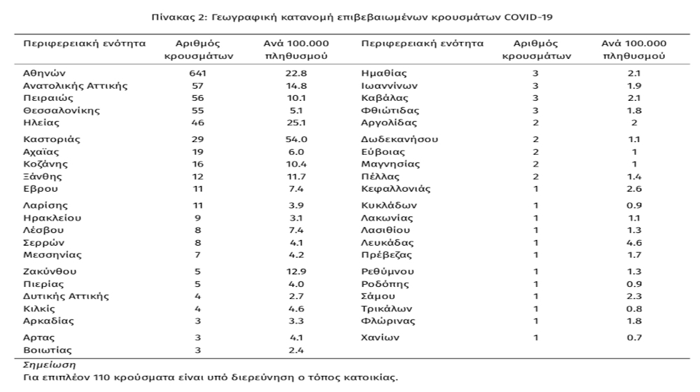 Όσον αφορά τη γεωγραφική κατανομή των κρουσμάτων στη χώρα η Αττική συγκεντρώνει τον μεγαλύτερο αριθμό και ακολουθούν κάποιες περιοχές της χώρας όπως η Θεσσαλονίκη, η Καστοριά, η Ηλεία, η Κοζάνη, η Αχαΐα και η Ξάνθη, όπου υπήρξαν εστίες νέων μολύνσεων και μεγαλύτερη απ’ ότι φαίνεται έκθεση του πληθυσμού στον ιό. Όπως αποτυπώνεται και στον σχετικό χάρτη του ΕΟΔΥ ελάχιστες είναι πλέον οι περιοχές της χώρα όπου προς το παρόν επισήμως δεν έχει καταγράφει κάποιο κρούσμα κορονοϊού.