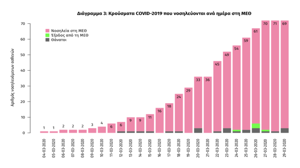 Στο παρακάτω διάγραμμα απεικονίζεται ο αριθμός των κλινών ΜΕΘ που νοσήλευαν ασθενείς με COVID-19 κατά τις τελευταίες ημέρες και με γκρίζο χρώμα αποτυπώνεται ο αριθμός των ασθενών που κατέληξαν την αντίστοιχη ημερομηνία. Οι αριθμοί αφορούν τους ασθενείς που συνεχίζουν να νοσηλεύονται.