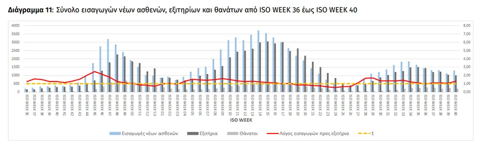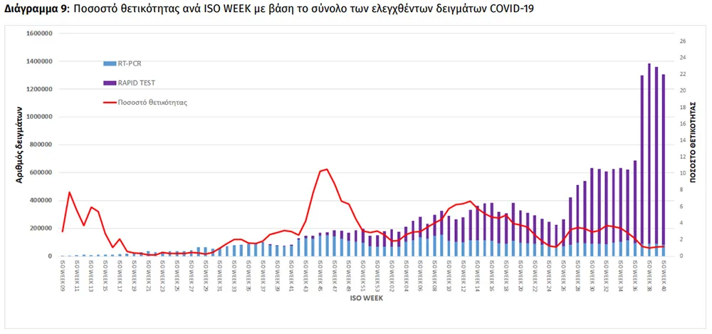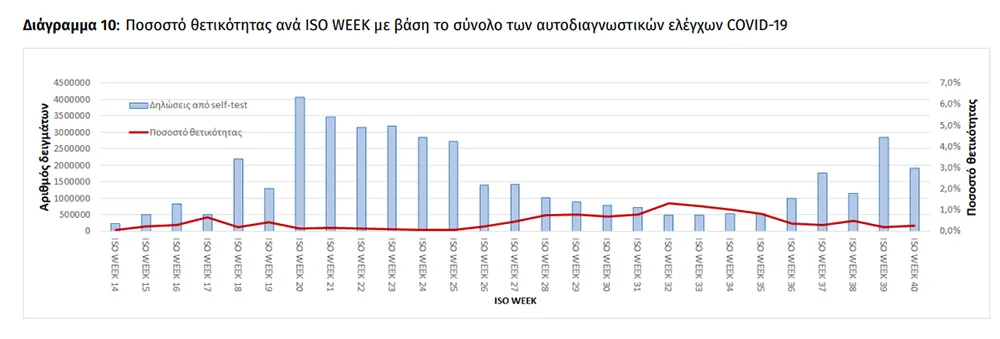 Συγκεκριμένα, όπως σημειώνεται στην ενημέρωση, την προηγούμενη εβδομάδα, το ποσοστό θετικότητας ήταν 1.17% σε σύνολο 1.303.844 εργαστηριακών ελέγχων (RT-PCR/Rapid-Ag) και 0.25% σε σύνολο 1.911.382 αυτοδιαγνωστικών ελέγχων. Στο σύνολο των ελέγχων, το ποσοστό θετικότητας ήταν 0.48%.