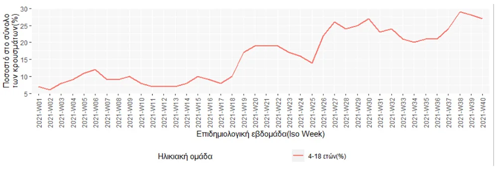 Ο αριθμός των κρουσμάτων κορονοϊού σε παιδιά ηλικίας 4-18 ετών ανέρχεται σε 4.135 αποτελώντας το 27% και παρουσίασε μείωση 3.57% σε σύγκριση με την προηγούμενη εβδομάδα.
