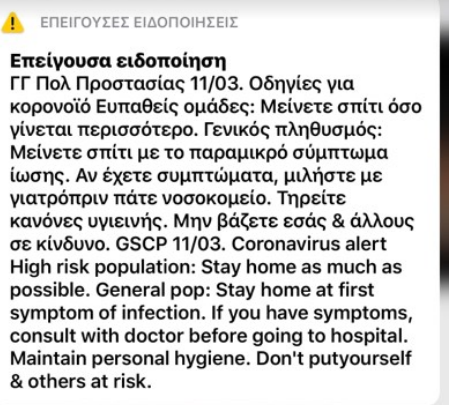 Με ένα μήνυμα στο κινητό η Γ.Γ Πολιτικής Προστασίας, δίνει οδηγίες για τον κορωνοϊό στις ευπαθεις ομάδες.Πιο συγκεκριμένα συμβουλεύει τους πολίτες που ανήκουν σε αυτή την κατηγορία να παραμείνουν στα σπίτια τους. Αν πάλι παρουσιάσουν κάποιο σύμπτωμα, να μιλήσουν με έναν γιατρό πριν πάνε στο νοσοκομείο.