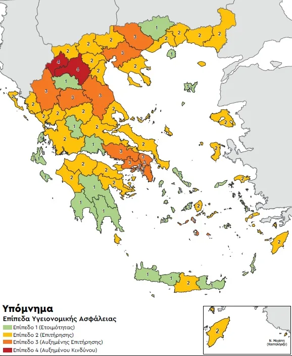 2 Περιφερειακές Ενότητες στο επίπεδο 4( Αυξημένου Κινδύνου) καμία περιοχή δεν ήταν σε αυτό το βαθμό συναγερμού πριν 14 μέρες.
