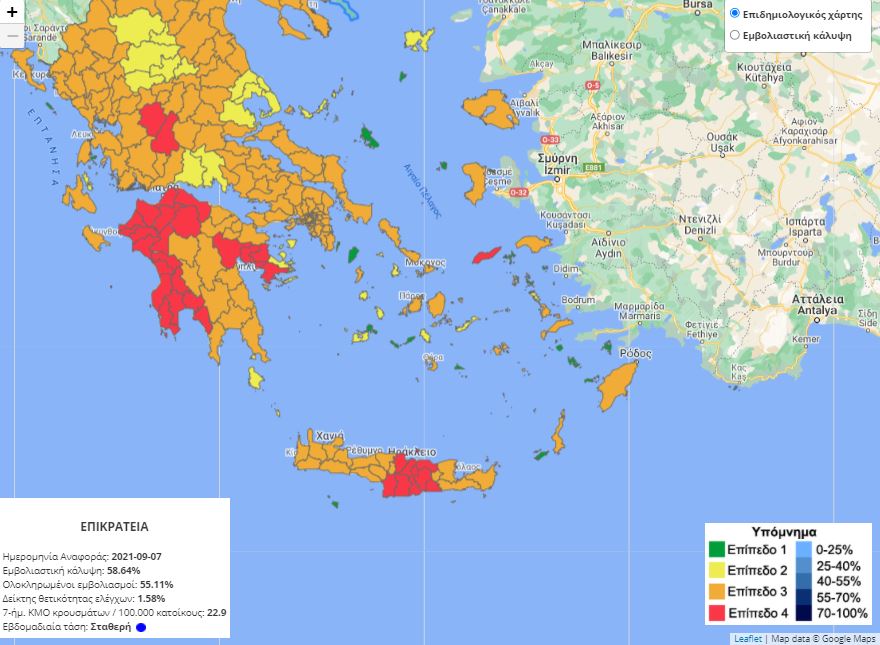 Στο ίδιο επίπεδο του επιδημιολογικού χάρτη βρίσκονται το Ηράκλειο, η Ικαρία, η Μεσσηνία, η Αχαΐα, η Ηλεία.