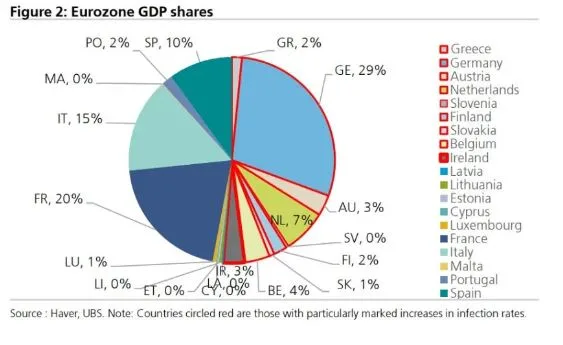 Εάν οι εννέα χώρες, μεταξύ αυτών και η Ελλάδα, που εμφανίζουν αύξηση των κρουσμάτων κατέφευγαν σε lockdown ανάλογο με εκείνο της Αυστρίας, η UBS υπολογίζει ότι η ζημιά στους ρυθμούς ανάπτυξης της Ευρωζώνης για το δ΄ τρίμηνο θα ήταν της τάξης των 0,7-0,8 ποσοστιαίων μονάδων, κάτι που σημαίνει ότι η Ευρωζώνη θα παρέμενε στάσιμη στο διάστημα αυτό.