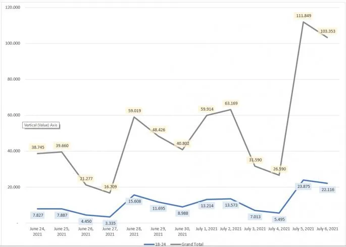 Ενδεικτικό είναι ότι ενώ στους νέους (18-24) μέχρι 3 Ιουλίου ο μεγαλύτερος ημερήσιος αριθμός προσέλευσης που είχε καταγραφεί ήταν 15.608 στις 28 Ιουνίου, στις 5 Ιουλίου προσήλθαν 23.875 και στις 6 Ιουλίου 22.116.