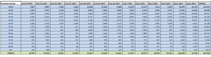 Σύμφωνα και με τους πίνακες η αύξηση που υπάρχει τις τελευταίες ημέρες, αφορά κυρίως τις ηλικιακές ομάδες 18-24 και 25-30, όπου ο αριθμός των εμβολιασμών έχει εκτοξευθεί.