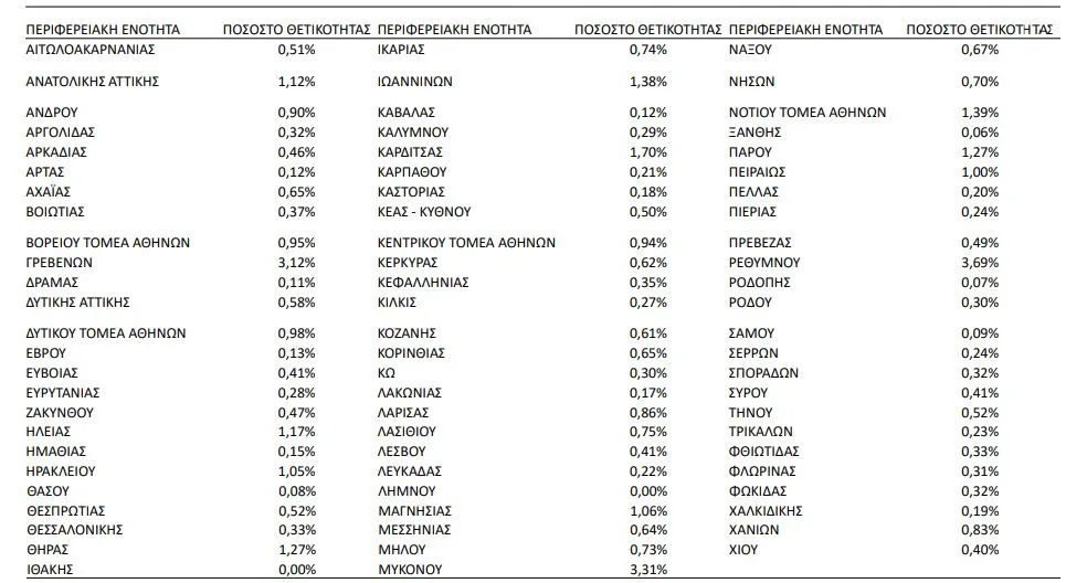 Στην υπόλοιπη χώρα, οι περιφέρειες που βρίσκονται πάνω από το 1% σε ποσοστά θετικότητας είναι οι: