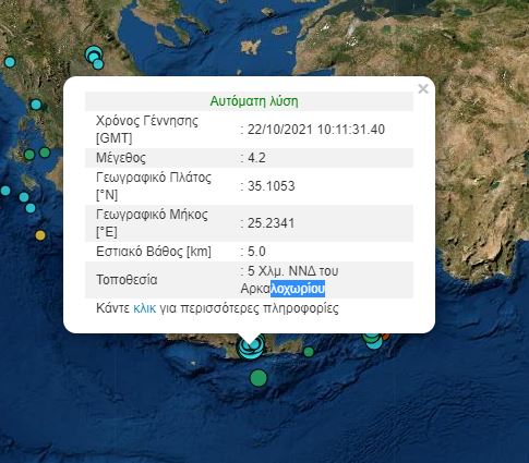 Σεισμός 4,2 Ρίχτερ στην Κρήτη το μεσημέρι της Παρασκευής. Μια νέα σεισμική δόνηση μεγέθους 4,2 βαθμών της κλίμακας Ρίχτερ σημειώθηκε στο Αρκαλοχώρι, συγκεκριμένα στις 13:11 το μεσημέρι της Παρασκευής πέντε χιλιόμετρα νοτιοδυτικά του Αρκαλοχωρίου.