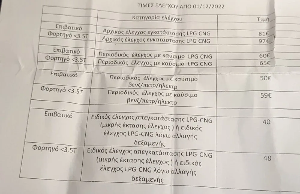 Τέλος αμετάβλητη παραμένει η τιμή του ειδικού ελέγχου απεγκατάστασης συστήματος Υγραερίου ή Φυσικού Αερίου ή ο ειδικός έλεγχος του συστήματος Υγραερίου ή Φυσικού Αερίου λόγω αλλαγής δεξαμενής σε αυτοκίνητο η οποία κοστίζει 40 ευρώ ενώ ο ίδιος έλεγχος σε φορτηγά έως 3,5 τόνους κοστίζει 48 ευρώ.