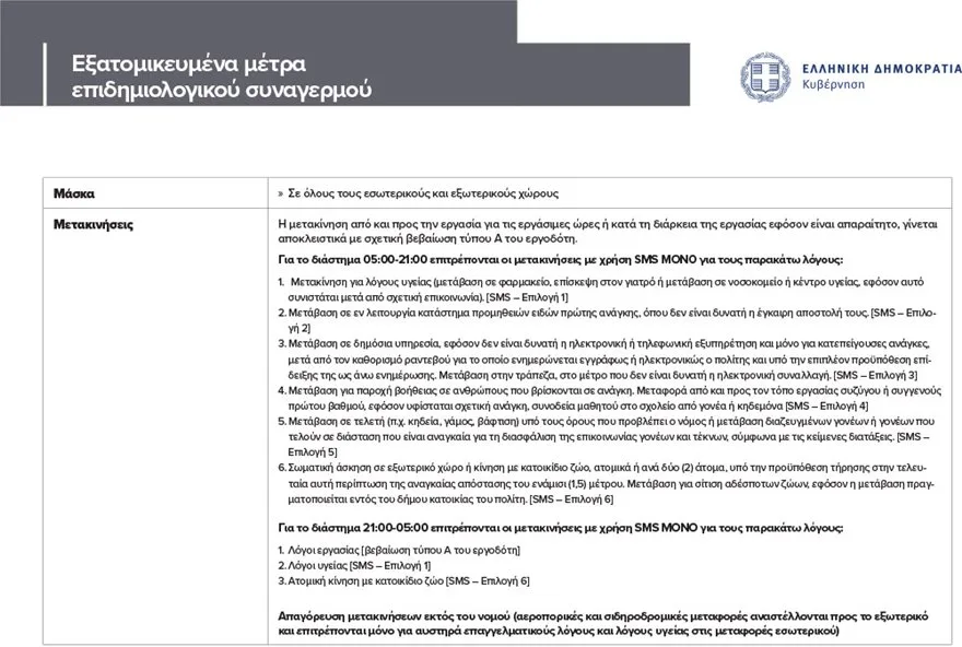 o Για το διάστημα 21:00-05:00 επιτρέπονται οι μετακινήσεις ΜΟΝΟ για λόγους εργασίας [με βεβαίωση εργοδότη τύπου Α, χωρίς SMS], υγείας [SMS – Επιλογή 1] και η ατομική κίνηση με κατοικίδιο ζώο [SMS – Επιλογή 6].