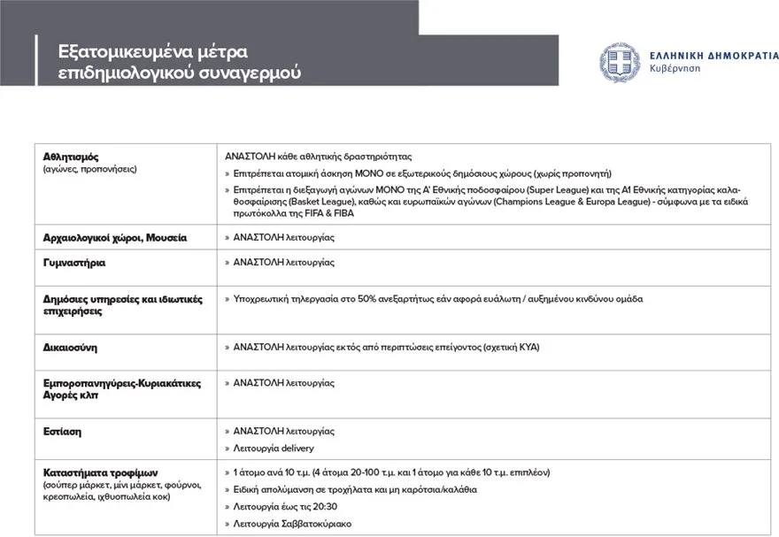 § Η εστίαση παραμένει σε αναστολή λειτουργίας, ενώ επιτρέπονται οι υπηρεσίες delivery. Τα καταστήματα τροφίμων λειτουργούν έως τις 20:30, ενώ προβλέπεται η λειτουργία τους και το Σαββατοκύριακο.