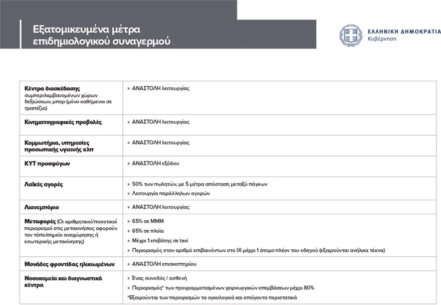 § Στους χώρους λατρείας, οι λειτουργίες πραγματοποιούνται χωρίς παρουσία πιστών, ενώ επιτρέπονται μόνο τελετές κηδειών με παρουσία έως 9 άτομα.
