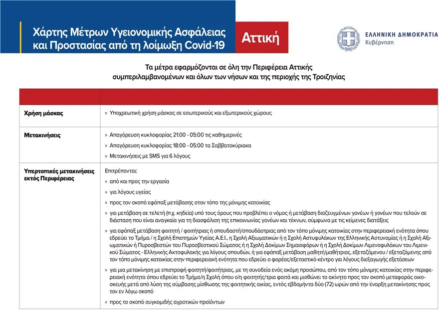 – Απαγόρευση κυκλοφορίας 21:00-05:00 καθημερινές, 18:00-05:00 Σαββατοκύριακα