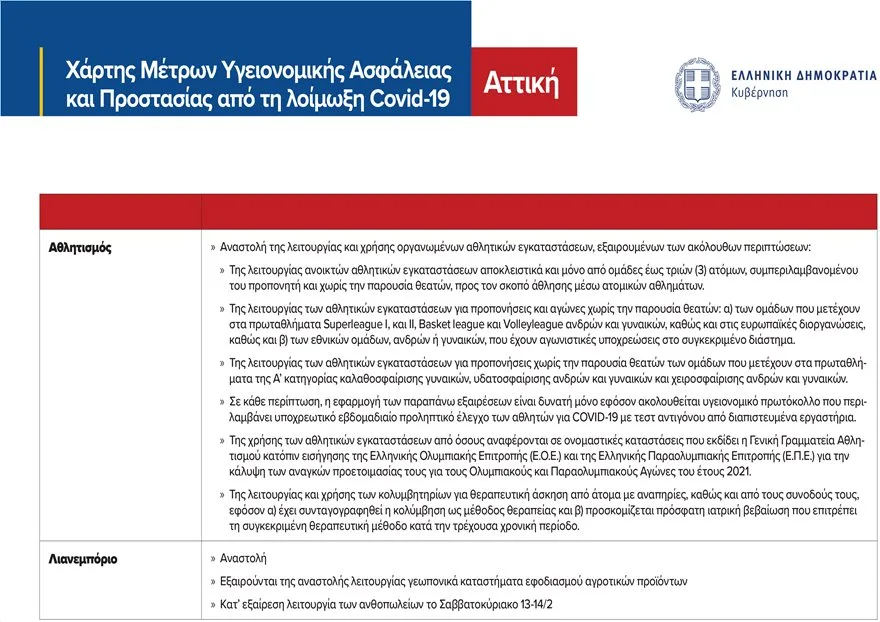 » Σε κάθε περίπτωση, η εφαρμογή των παραπάνω εξαιρέσεων είναι δυνατή μόνο εφόσον ακολουθείται υγειονομικό πρωτόκολλο που περιλαμβάνει υποχρεωτικό εβδομαδιαίο προληπτικό έλεγχο των αθλητών για COVID-19 με τεστ αντιγόνου από διαπιστευμένα εργαστήρια.