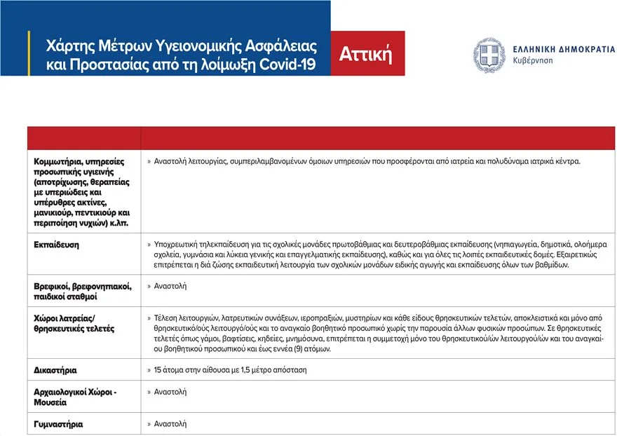 σχολεία, γυμνάσια και λύκεια γενικής και επαγγελματικής εκπαίδευσης), καθώς και για όλες τις λοιπές εκπαιδευτικές δομές. Εξαιρετικώς επιτρέπεται η διά ζώσης εκπαιδευτική λειτουργία των σχολικών μονάδων ειδικής αγωγής και εκπαίδευσης όλων των βαθμίδων.