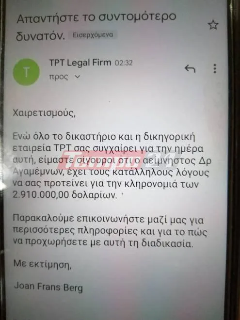 Το μήνυμα , όπως θα δείτε παρακάτω, αναφέρει πως την έχουν προτείνει για να κληρονομήσει 3 εκατ δολάρια .