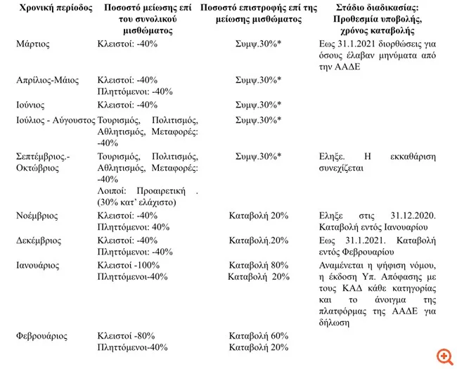 Το αρχικό ποσοστό του ποσού 30% επί της μείωσης, συμψηφιζόμενου με τρέχουσες φορολογικές υποχρεώσεις, αυξήθηκε σε καταβολή του 50%, το οποίο είχε εξ αρχής διεκδικήσει η ΠΟΜΙΔΑ και θα φθάσει ακόμη και σε ποσοστό έως και 80% για τους μήνες Ιανουάριο και Φεβρουάριο 2021 στις επιχειρήσεις που παρέμειναν κλειστές με κρατική εντολή.