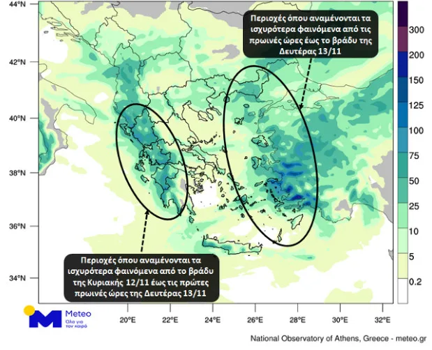 Σύμφωνα με την πρόβλεψη του Meteo, τα έντονα καιρικά φαινόμενα θα σταματήσουν αργά τη νύχτα της Δευτέρας (13/11). Η κακοκαιρία θα «χτυπήσει» τα δυτικά