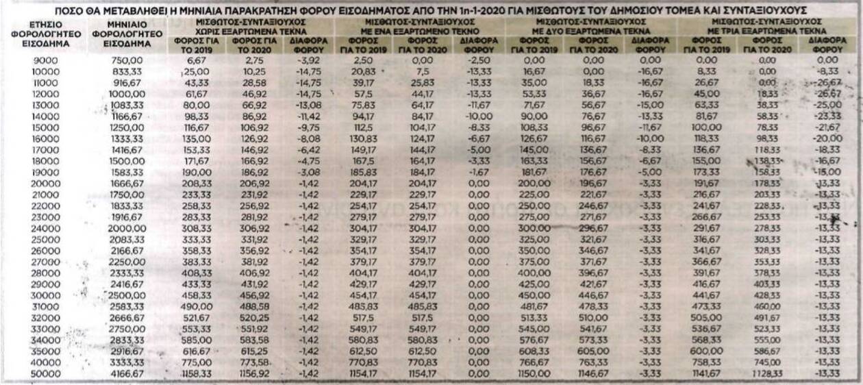Ως εκ τούτου η μηνιαία παρακράτηση φόρου εισοδήματος επί των αποδοχών των δημοσίων υπαλλήλων για το 1ο δεκαπενθήμερο του μηνός Ιανουαρίου 2020 και επί του συνόλου των συντάξεων του Ιανουαρίου 2020 θα υπολογιστεί και πάλι με τη φορολογική κλίμακα η οποία ισχύει μέχρι τις 31-12-2019.