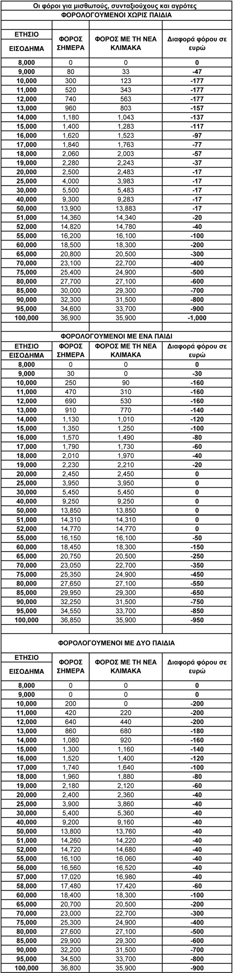 Η νέα φορολογική κλίμακα, με τον χαμηλό συντελεστή του 9% για το τμήμα του εισοδήματος έως τα 10.000 ευρώ και τους μειωμένους κατά μια μονάδα συντελεστές, θα ελαφρύνει περισσότερο τους μισθωτούς και τους συνταξιούχους με αποδοχές έως και 12.000 ευρώ τον χρόνο ενώ πολύ μικρό όφελος έως μηδαμινό θα έχουν οι έχοντες εισοδήματα από 12.000 έως 50.000 ευρώ. Το όφελος για την μεσαία τάξη ουσιαστικά εκμηδενίζεται λόγω της αλλαγής στην έκπτωση φόρου που προβλέπεται για μισθωτούς και συνταξιούχους.