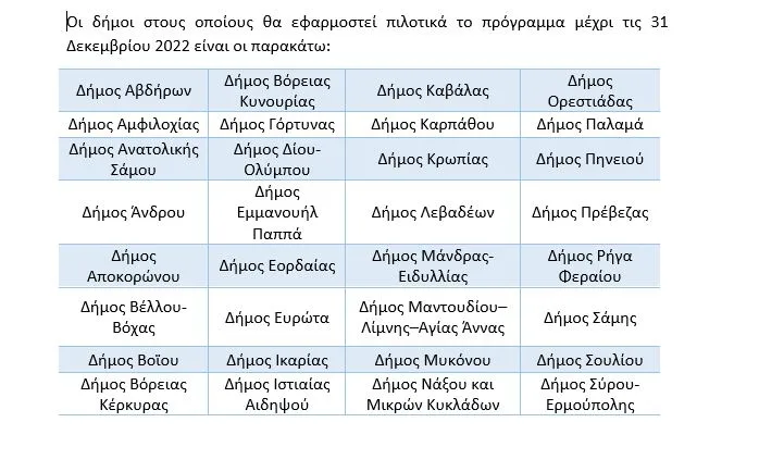 Οι δήμοι στους οποίους θα εφαρμοστεί πιλοτικά το πρόγραμμα, μέχρι τις 31 Δεκεμβρίου 2022