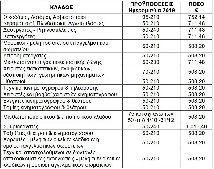 Οικοδόμου, λατόμου, ασβεστοποιού, κεραμοποιού, πλινθοποιού, αγγειοπλάστη, δασεργάτη, ρητινοσυλλέκτη, καπνεργάτη, μουσικού -μέλους του οικείου επαγγελματικού σωματείου, υποδηματεργάτη, μισθωτού ναυπηγοεπισκευαστικής ζώνης, χειριστή εκσκαπτικών, ανυψωτικών, οδοποιητικών, γεωτρητικών μηχανημάτων, ηθοποιού, τεχνικού κινηματογράφου και τηλεόρασης χειριστή και βοηθού χειριστή κινηματογράφου, ελεγκτή κινηματογράφου και θεάτρου, ταμία κινηματογράφου και θεάτρου, μισθωτού τουριστικού και επισιτιστικού κλάδου, σμυριδεργάτη, το επάγγελμα του ταξιθέτου θεάτρου -κινηματογράφου, του χορευτή -μέλους των οικείων κλαδικών ή ομοιοεπαγγελματικών σωματείων, καθώς και του τεχνικού απασχολούμενου σε ζωντανές οπτικοακουστικές εκδηλώσεις -μέλους των οικείων κλαδικών ή ομοιοεπαγγελματικών σωματείων.