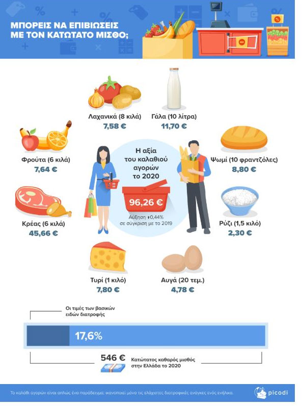 Σύμφωνα με την έρευνα της Picodi.com η συνολική τιμή των βασικών προϊόντων διατροφής ανέρχεται σε 96,26 ευρώ, κατά 0,44% αυξημένη από ό, τι το προηγούμενο έτος ενώ το βασικό καλάθι αγορών αντιστοιχεί στο 17,6% του κατώτατου καθαρού μισθού.