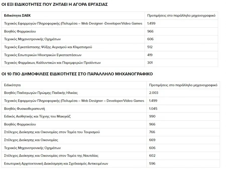 Με τουλάχιστον 110 ειδικότητες προσφερόμενες από τις ΣΑΕΚ, αυτές που σχετίζονται με τη φροντίδα βρεφών είτε με παραϊατρικά επαγγέλματα, όπως ο Βοηθός Φυσικοθεραπευτή ή ο Βοηθός Φαρμακείου, βρίσκονται, όπως αναφέρει σε δημοσίευμά του ο Ελεύθερος Τύπος, σταθερά ψηλά στις επιλογές των υποψηφίων βάσει των φετινών προτιμήσεων στο παράλληλο μηχανογραφικό.