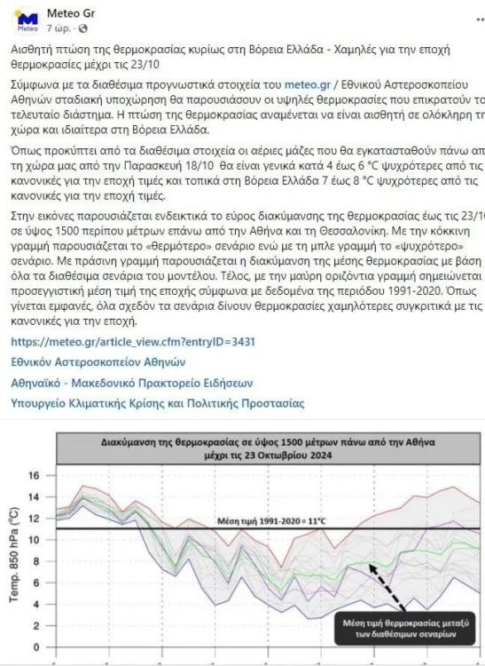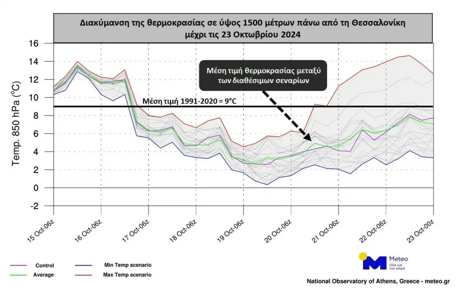 Στην εικόνες παρουσιάζεται ενδεικτικά το εύρος διακύμανσης της θερμοκρασίας έως τις 23/10 σε ύψος 1500 περίπου μέτρων επάνω από την Αθήνα και τη Θεσσαλονίκη. Με την κόκκινη γραμμή παρουσιάζεται το «θερμότερο» σενάριο ενώ με τη μπλε γραμμή το «ψυχρότερο» σενάριο.