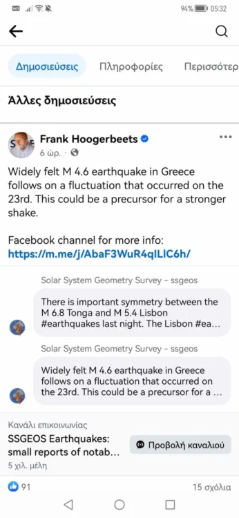 Συγκεκριμένα ο Ολλανδός ερευνητής ανέφερε: Ευρέως αισθητός σεισμός 4,6 στην Ελλάδα ακολουθεί διακύμανση που σημειώθηκε στις 23 του μηνός. Αυτό θα μπορούσε να είναι ένας πρόδρομος για ένα ισχυρότερο κούνημα.
